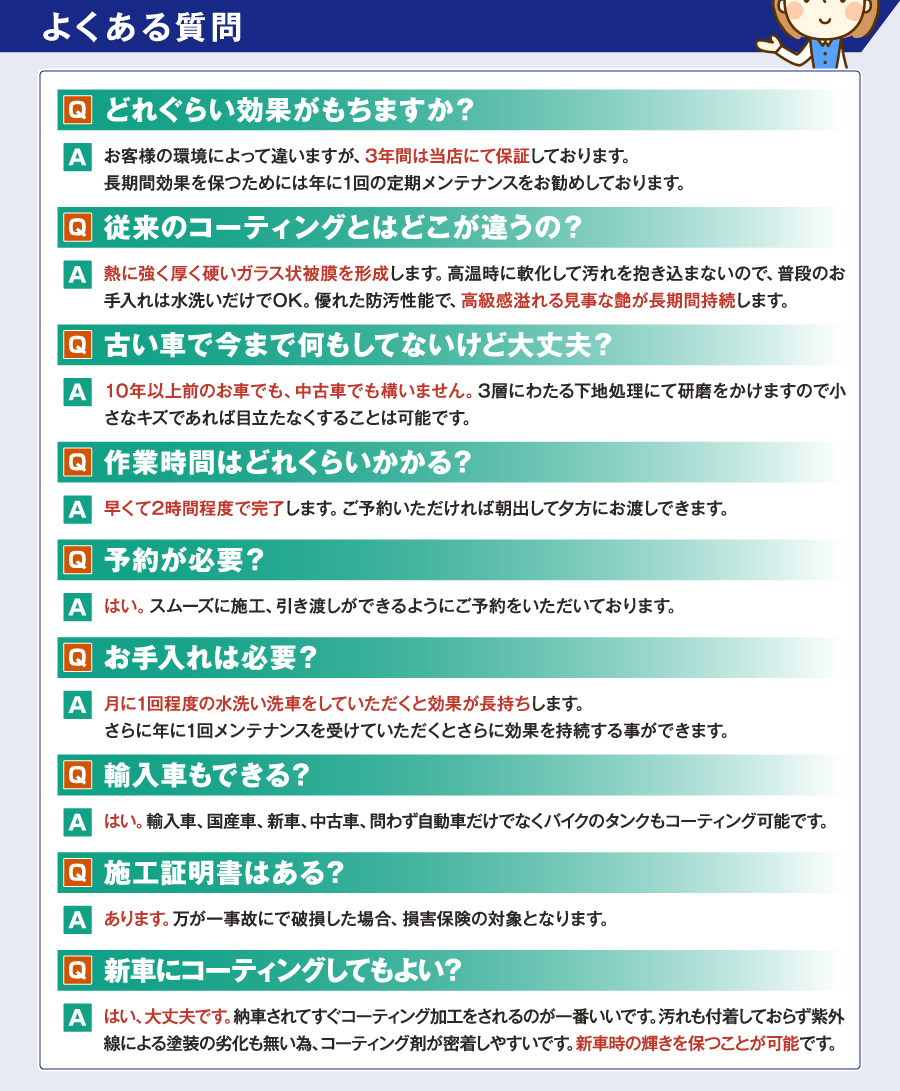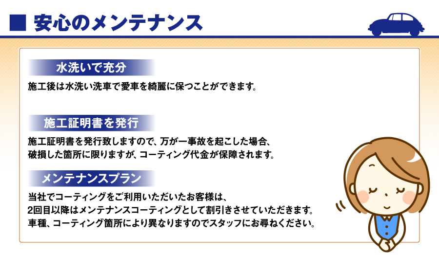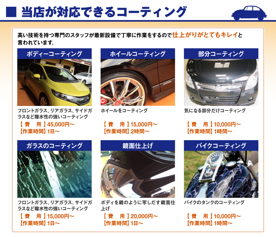 国の認可を受けた安心のFAS認証整備工場です。 国産車から輸入車までどのようなお車でも承ります。 低価格で高技術のサービスを心がけ、安全に配慮しております。 カーコーティング、洗車のことならお気軽にご来店ください。 新車の輝きを保つカーコーティングでいつも車ピカピカ!! 坂本自動車なら、コーティング後のメンテナンス、コーティングを長持ちさせる為のサポート致します。 |