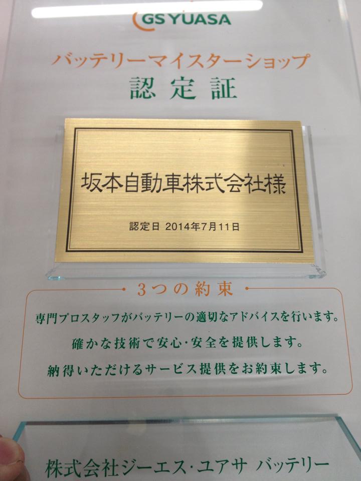 坂本自動車のスタッフ3人がGSユアサバッテリーマイスターの資格を取得し、バッテリーマイスターのいる店として認定されました。